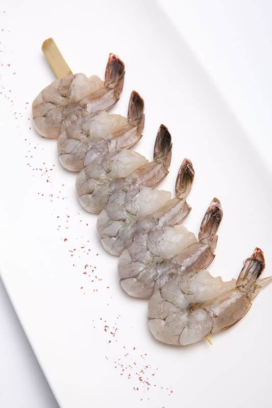 Frozen raw shrimp skewer made from vannamei shrimp tails (PTO) mounted on a bamboo skewer, approximately 80 g per piece. Produced in Vietnam.