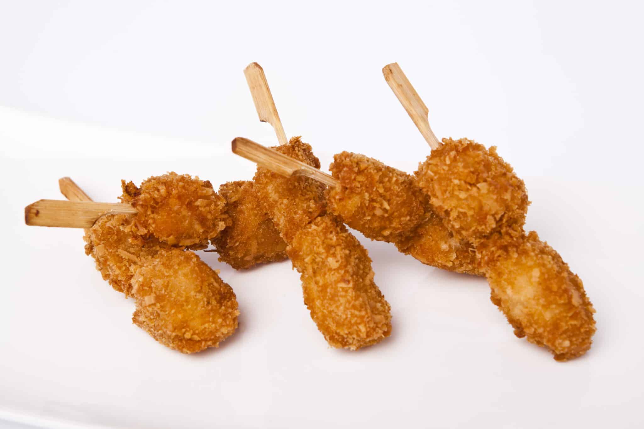 Skewer made with tender chicken pieces (100% chicken breast), marinated and coated in a crispy breadcrumb crust subtly flavoured with coconut and massaman curry. This recipe delivers a balanced combination of exotic sweetness and mild spices, with a crunchy yet tender texture.
