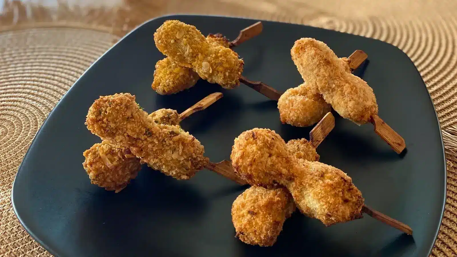 An assortment of 4 breaded mini chicken skewers, each marinated and coated in a crispy breading inspired by Asian flavours: green curry, coconut massaman, korma and massala. Made from 100% chicken breast, tender and delicately seasoned, these skewers deliver a gourmet contrast between golden breading and juicy meat.