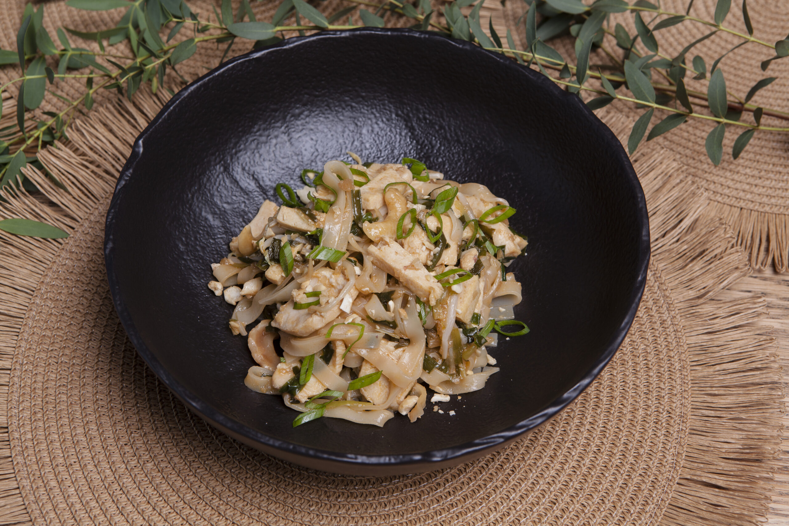 The authentic thai street food, a dish made with chicken, rice noodles, vegetables, tofu, and a tamarind seasoning.