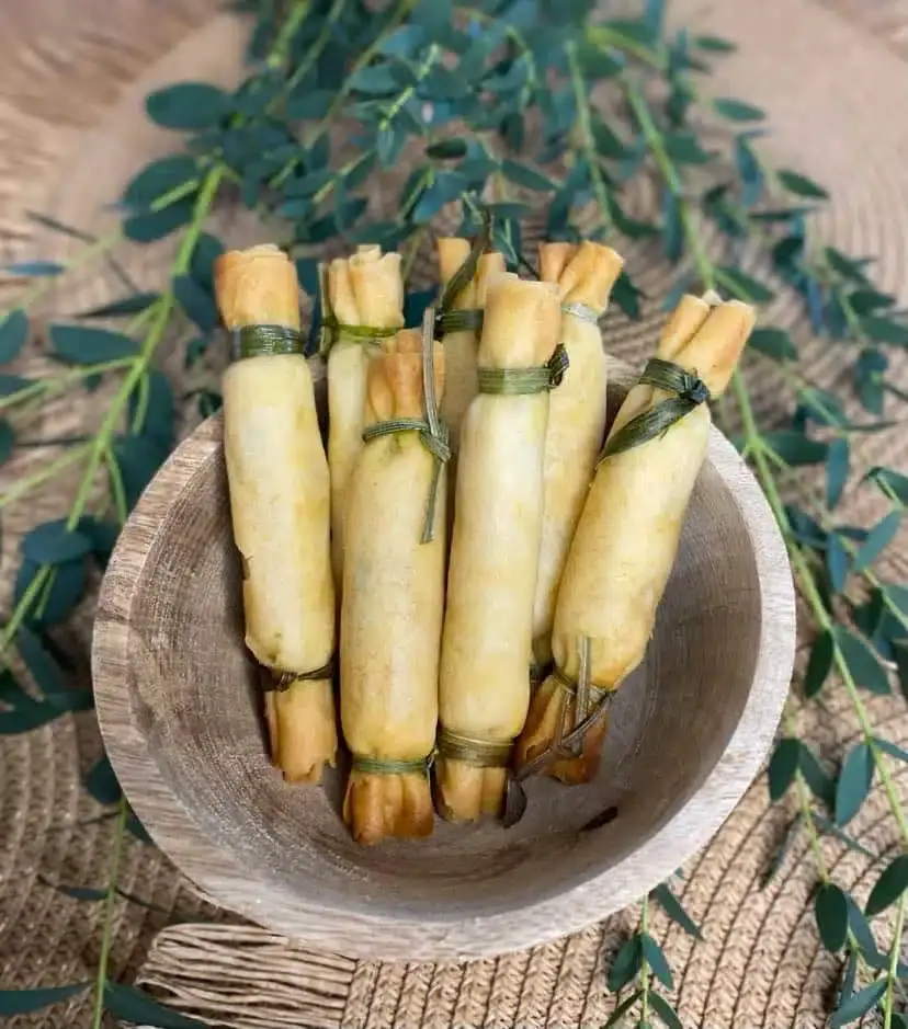 A crispy stick filled with a chicken stuffing made with red curry, coconut milk and basil, tied with a pandan leaf for an elegant presentation. This original format reimagines the appetiser with authentic Thai flavours and an exotic twist, ideal for enhancing your buffets, cocktail parties or premium finger food selections. Easy to reheat, these cigars add a delicious and exotic bite to all your snack offerings.