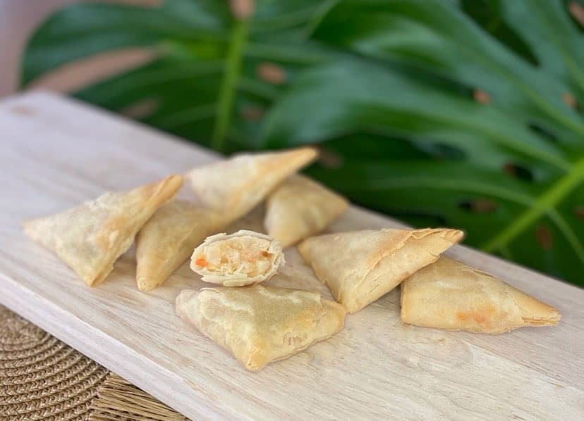 Delicately golden and crispy, these shrimp samosas feature a generous filling made with shrimps, yam, bamboo shoots, carrot and spring onion, wrapped in a thin, crispy wheat pastry. Inspired by Asian cuisine, they deliver a balanced bite combining seafood freshness and crunchy vegetables.