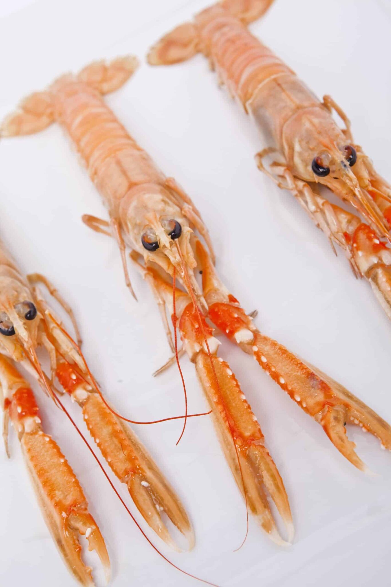 Frozen whole raw langoustines (Nephrops norvegicus), land‑frozen, from MSC‑certified sustainable fisheries, fishing area FAO 27, origin Denmark.