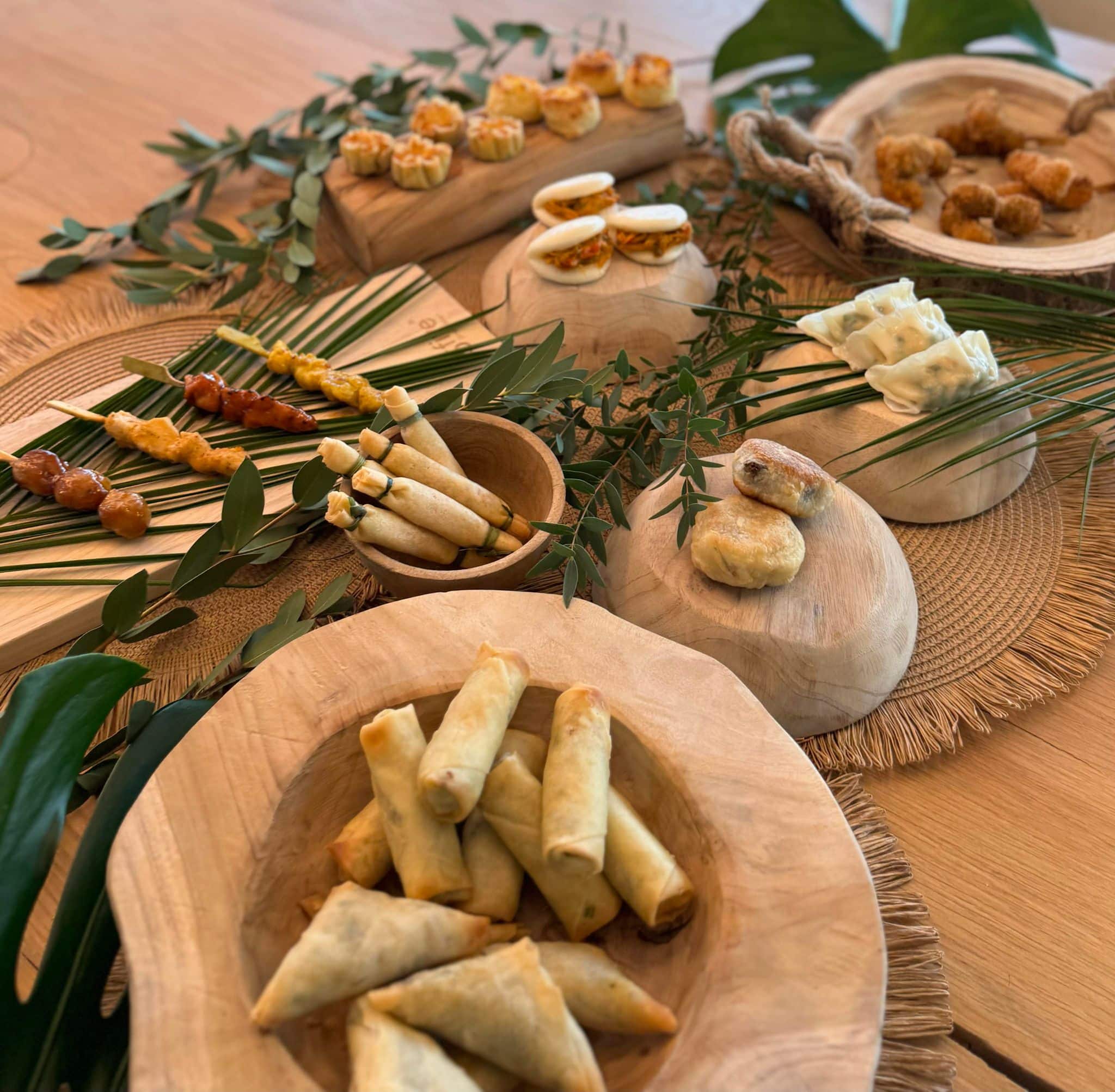 Bouchées de poulet saté en forme de fleurs, bao burgers poulet BBQ et brochettes yakitori satay, réchauffés et dressés avec sauces cacahuète et sésame.