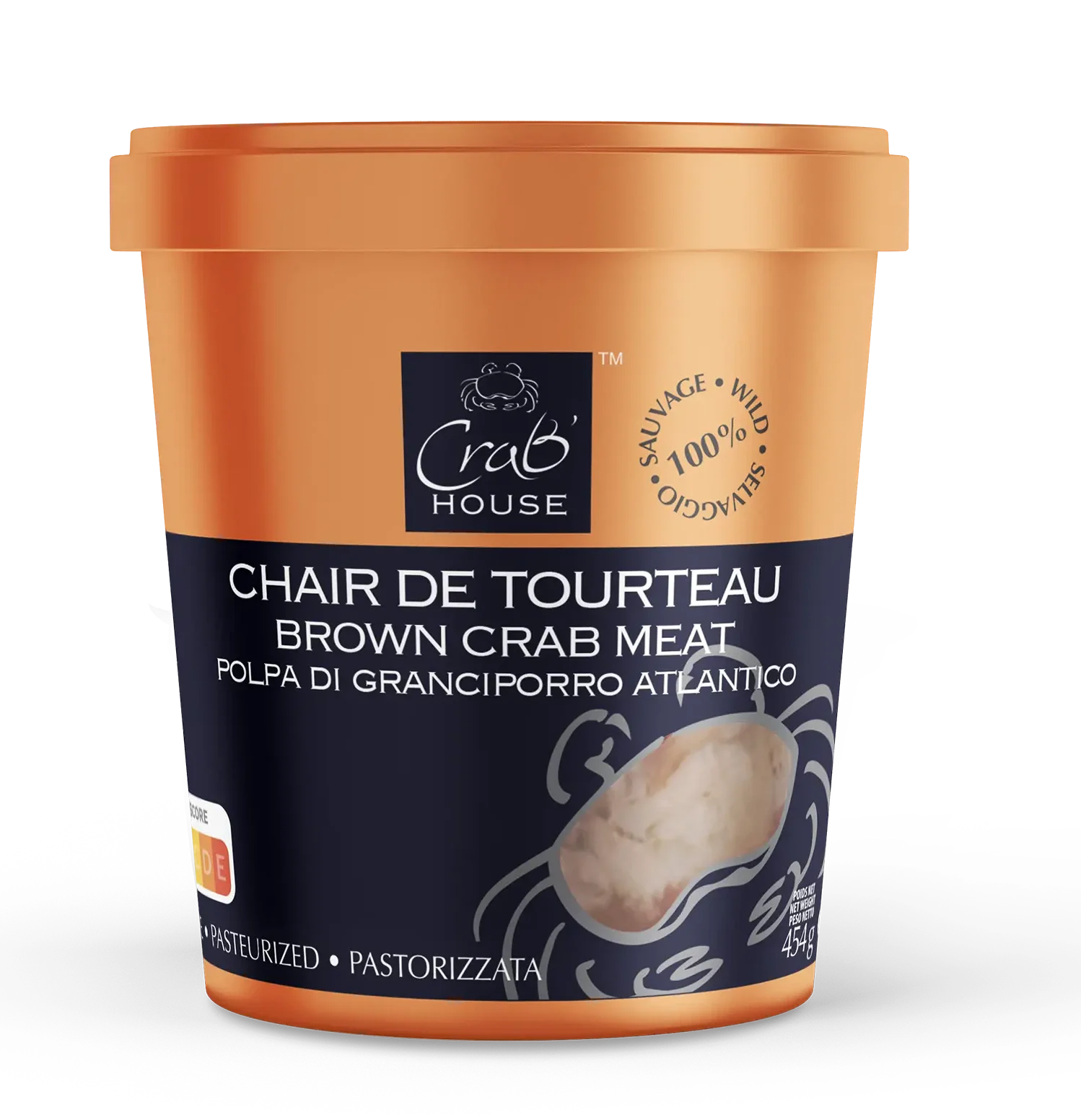 Chair de tourteau composée de morceaux généreux de pattes et de chair fine de corps. Entièrement cuite et pasteurisée, elle révèle un équilibre parfait entre texture ferme et fondante, aux notes iodées typiques du crustacé.