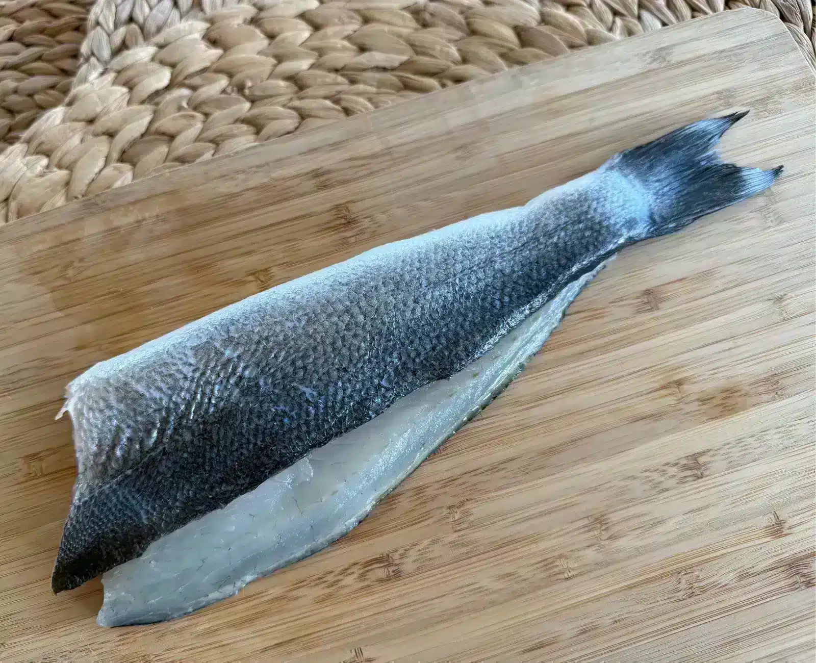 Filet de bar double surgelé (Dicentrarchus labrax), avec peau et sans arête, origine Turquie.
