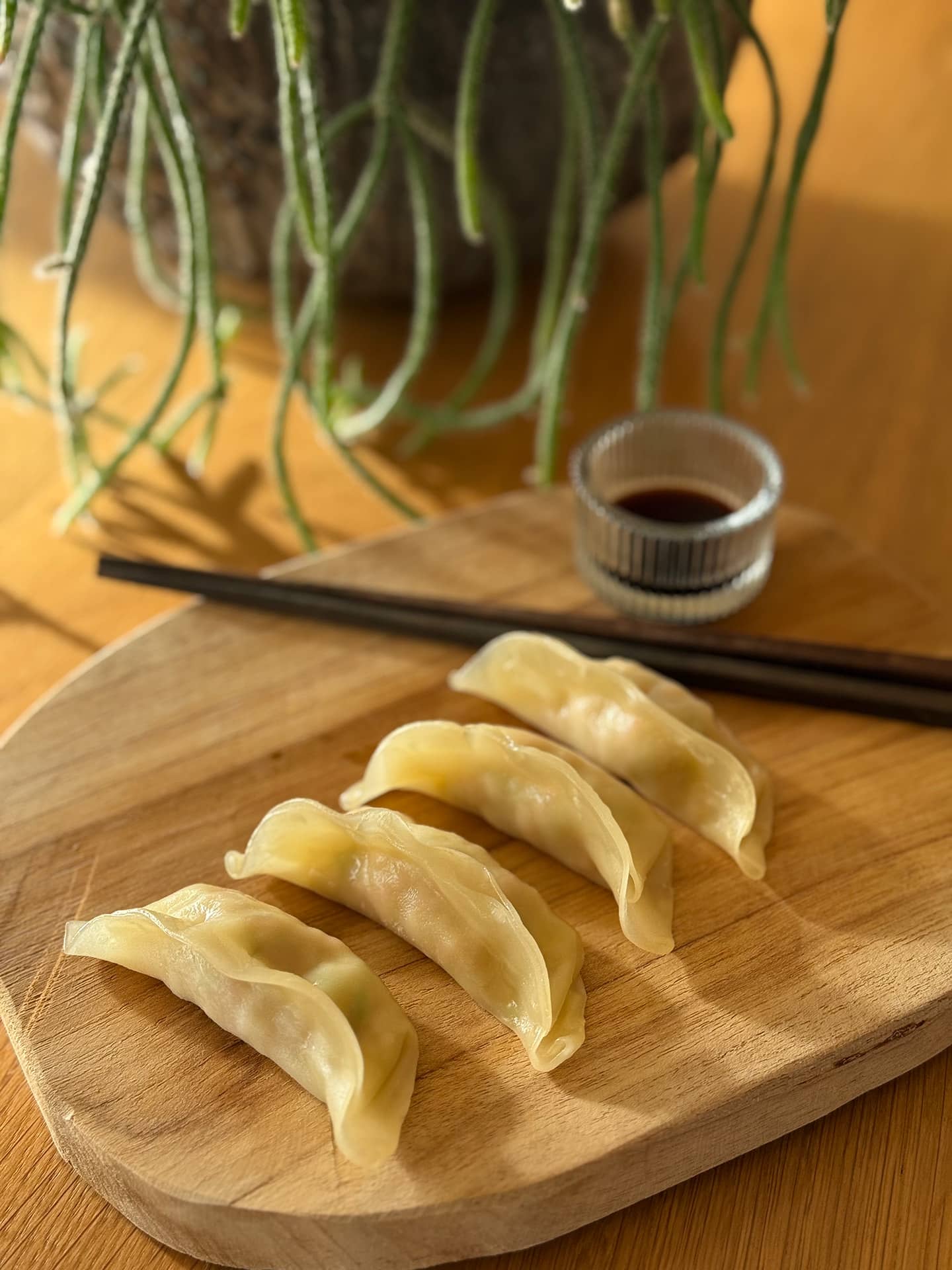 Faire dorer les gyozas dans une poêle chaude avec 2 cuillères à soupe d’huile pendant 2 minutes, puis ajouter ½ verre d’eau, couvrir et poursuivre jusqu’à absorption complète.