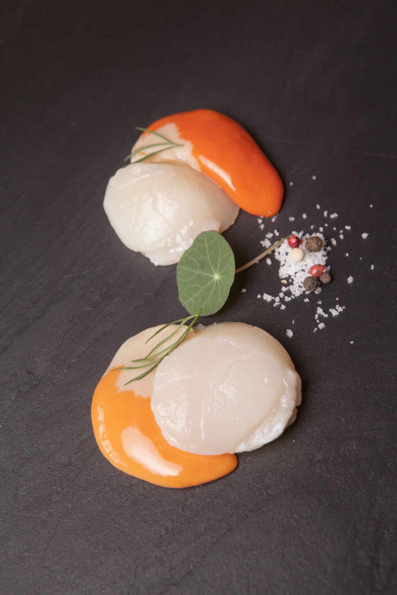 Noix de Saint‑Jacques françaises surgelées (Pecten maximus), avec corail, issues de pêche Label Rouge. Produits surgelés à terre, pêchés au départ de Dieppe.