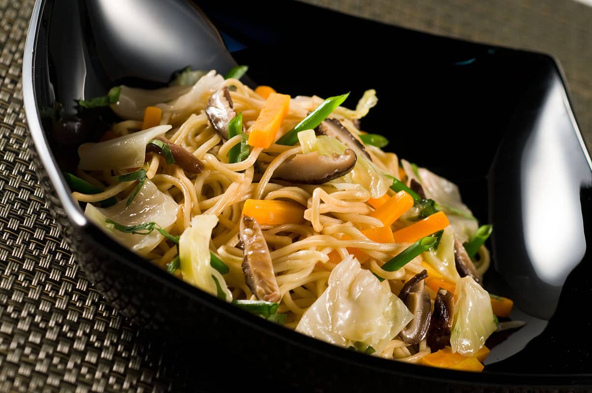 Fines nouilles de blé cuisinées avec un mélange de légumes (chou chinois, carotte, champignons chinois, ciboule), délicatement assaisonnées d’une sauce à base de sauce soja et d’huile de sésame. Cette recette offre un accompagnement végétal équilibré, prêt à l’emploi, adapté aux usages professionnels.